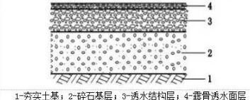 (1)路面結(jié)構(gòu):露骨透水混凝土路面自下而上主要由夯實土基、碎石基層、透水結(jié)構(gòu)層、露骨透水面層四個部分組成,如圖1。