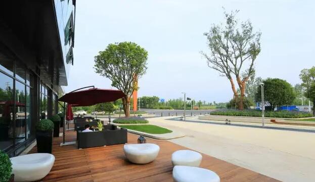 部外部實景圖——由近及遠鋪裝材質依次為木、石材、透水混凝土,層次分明,舒適的洽談空間加入室外軟裝布品后,形成精心、雅致的室外空間