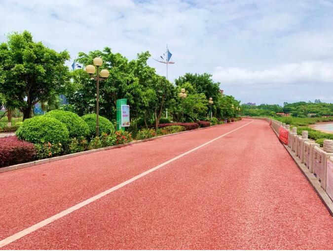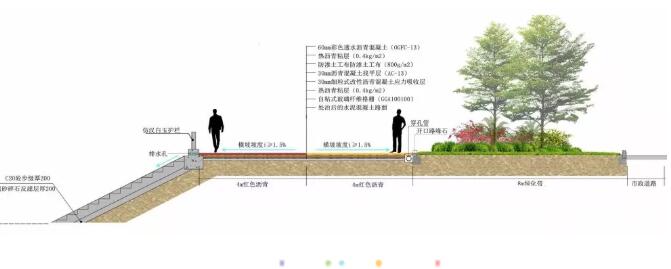 綠道主要是透水瀝青的結(jié)構(gòu),包含了3cm的應(yīng)力吸收層和3cm的瀝青找平層,最后面層才是6cm厚的紅色透水瀝青層,排水坡度設(shè)計(jì)為1.5%。其中依靠自粘式玻璃纖維格柵來防止原路面的反射裂縫,通過熱瀝青油來對各層進(jìn)行粘合。