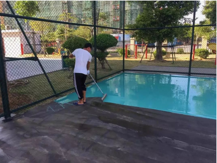 2.試水:全場(chǎng)灑水,將地面積水處用粉筆做個(gè)記號(hào)、采用丙烯酸中涂層進(jìn)行局部修補(bǔ)(積水修補(bǔ)及中涂施工應(yīng)交叉進(jìn)行、以免圖層后留有痕跡);